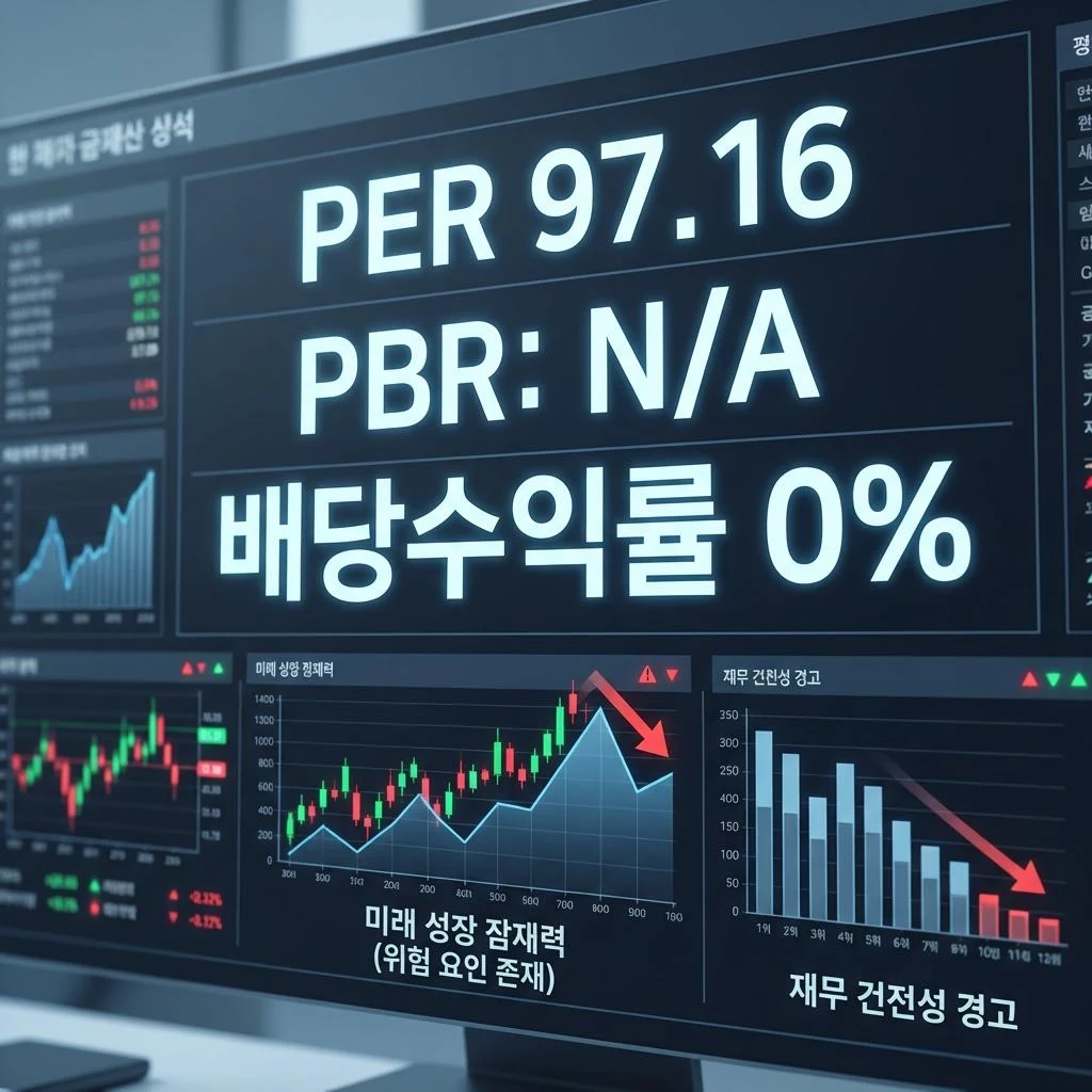 PBR (주가순자산비율): PBR이 '없음'으로 표기된 것은 재무제표 상의 특수한 상황 또는 정보의 제한을 의미할 수 있습니다. 일반적으로 PBR은 기업의 순자산 가치 대비 주가를 평가하는 지표로, '없음'이라는 표기는 자산 가치에 기반한 밸류에이션이 어렵거나, 또는 기업이 자산 성장보다는 무형의 기술력이나 시장 지배력 확보에 주력하고 있음을 나타낼 수 있습니다. 이 경우, PBR 외 다른 지표들을 통해 기업의 '실질 가치'를 판단해야 하는 복잡성이 추가됩니다. 투자자는 PBR 부재가 단순한 정보 누락이 아닌 잠재적 리스크 신호일 수 있음을 고려해야 합니다.