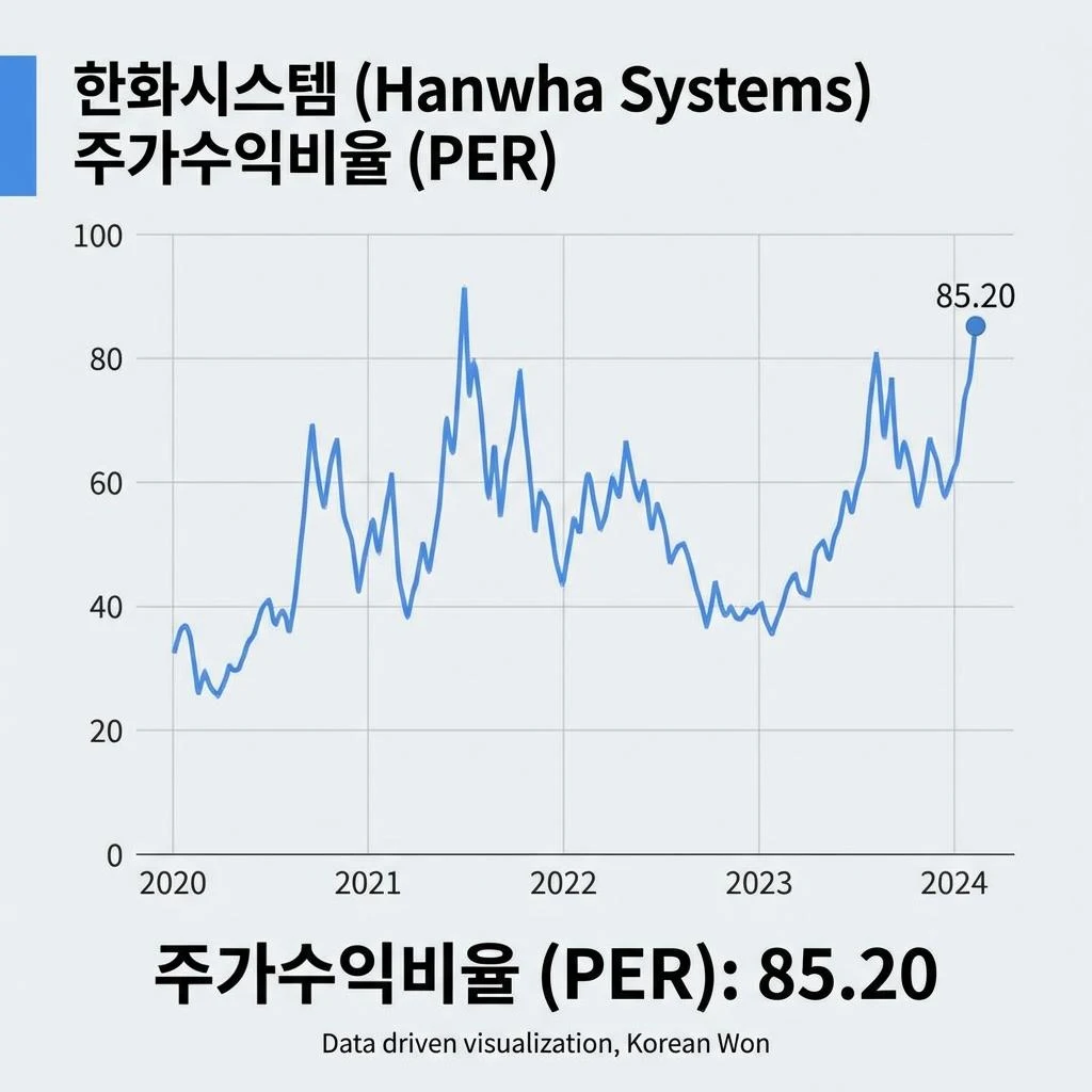 한화시스템의 현재 PER(주가수익비율)은 85.20107로, 이는 동종 업계 평균을 크게 상회하는 매우 높은 수준입니다. 일반적으로 높은 PER은 시장이 해당 기업에 상당한 미래 성장 프리미엄을 부여하고 있음을 의미하지만, 동시에 현재 이익 대비 주가가 고평가되어 있을 가능성도 내포합니다. 이러한 프리미엄이 기업의 실제 현금흐름 창출 능력과 이익 성장에 기반한 것인지 면밀한 검토가 필수적입니다.