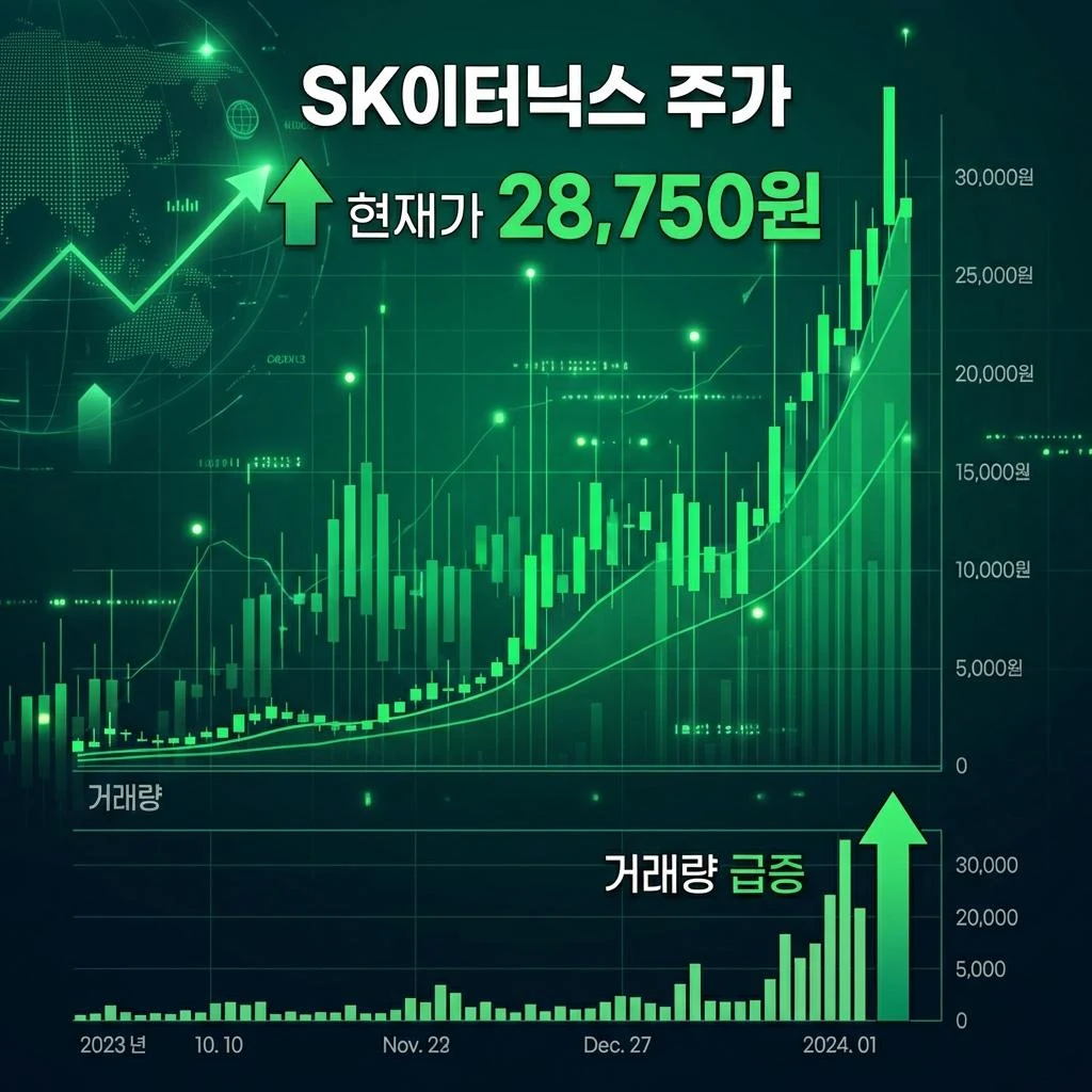 SK이터닉스의 현재가는 28,750원으로, 오늘 하루에만 29.91% 급등하며 시장의 강력한 기대감을 반영하고 있습니다. 그러나 제공된 데이터에 따르면 PER(주가수익비율)과 PBR(주가순자산비율)은 'None'으로 표기되어 있으며, 애널리스트 목표주가 정보도 부재합니다. 배당수익률 또한 0.00%로 확인됩니다.